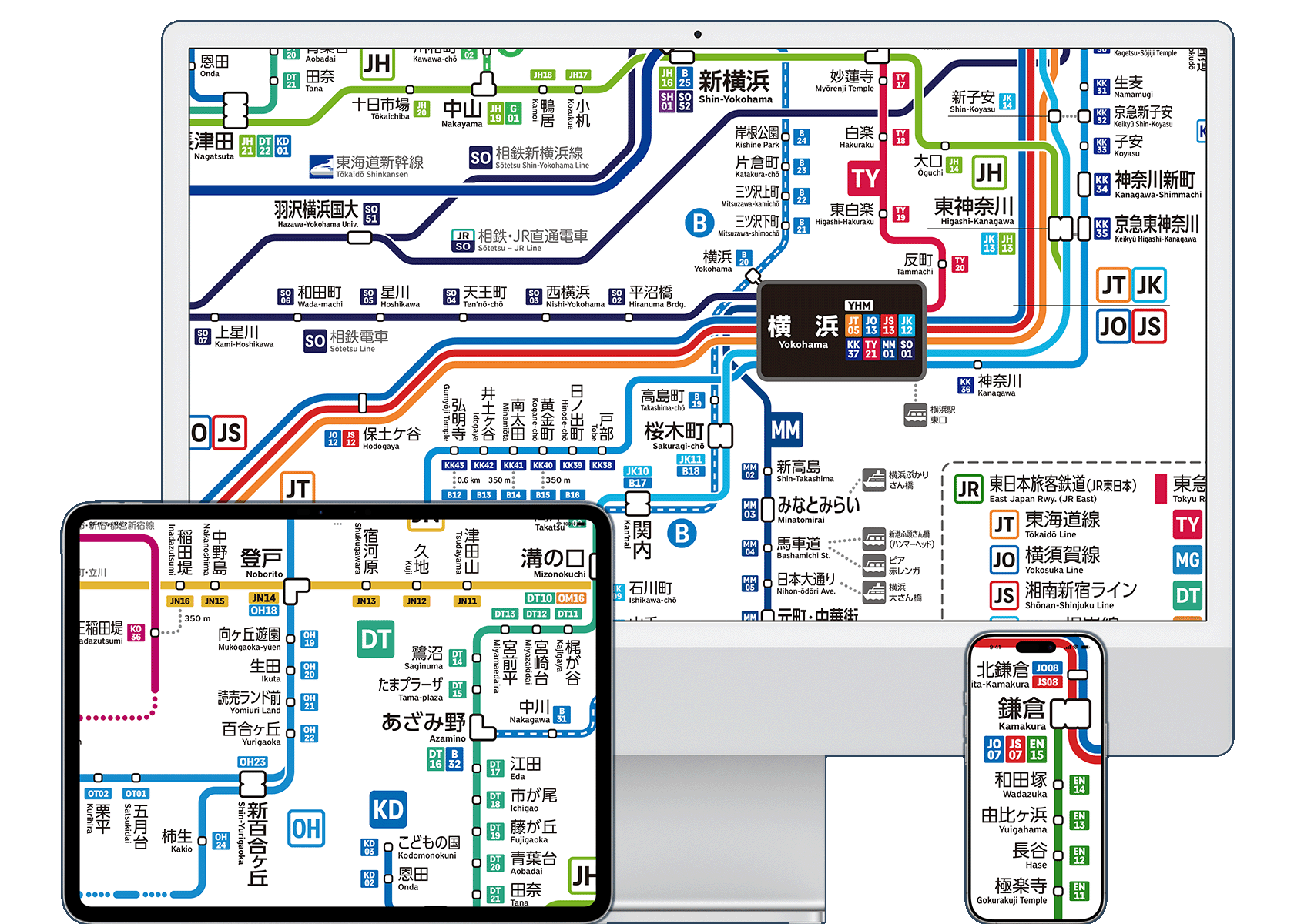 神奈川県内のすべての鉄道路線と駅を網羅した、便利なデジタル路線図です。鉄道だけでなく、空港や駅からアクセスできる旅客港も載っており、大変便利です。