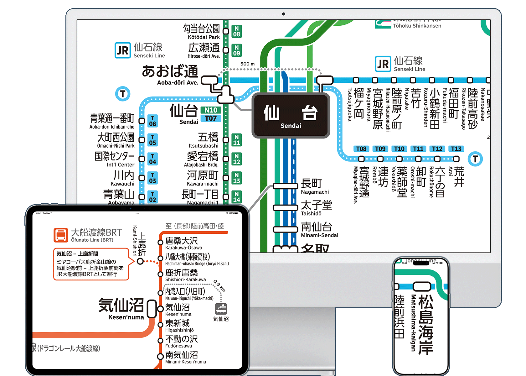 宮城県内のすべての鉄道路線と駅を網羅した、便利なデジタル路線図です。鉄道だけでなく、空港や駅からアクセスできる旅客港も載っており、大変便利です。