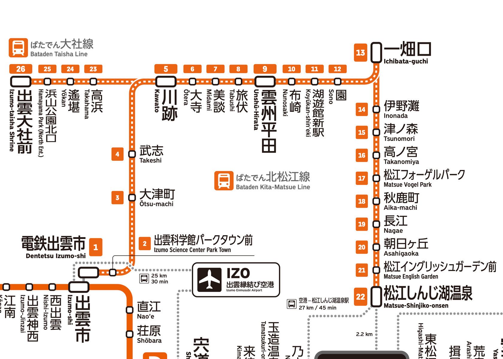 島根県内のすべての鉄道路線と駅を網羅した、便利なデジタル路線図です。鉄道だけでなく、空港や駅からアクセスできる旅客港も載っており、大変便利です。