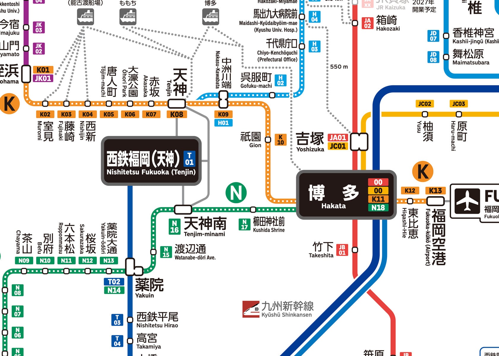 福岡県内のすべての鉄道路線と駅を網羅した、便利なデジタル路線図です。鉄道だけでなく、空港や駅からアクセスできる旅客港、BRTひこぼしラインも載っており、大変便利です。