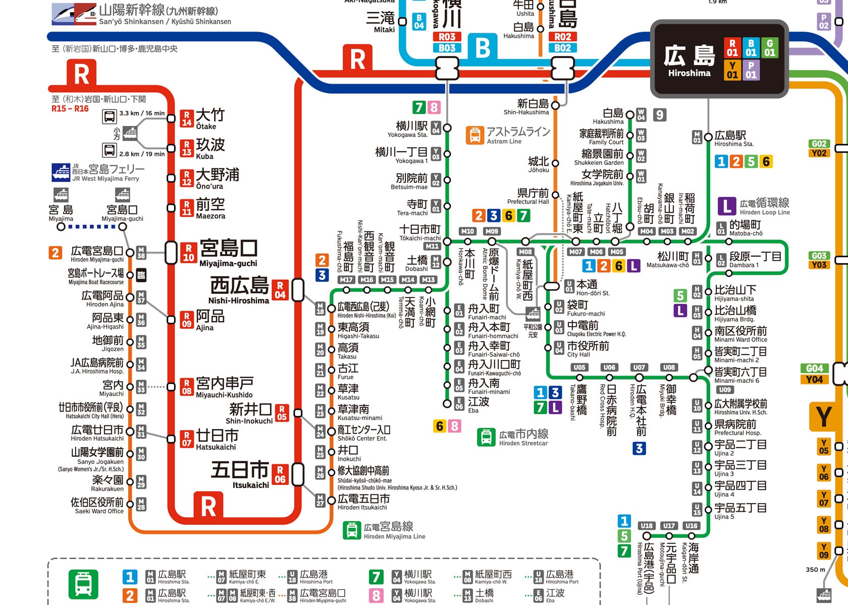 県内の鉄道路線だけでなく、空港や駅からアクセスできる旅客港も載っているほか、広島県ではJRグループ唯一の定期航路であるJR宮島航路も掲載しており、とても便利です。個人利用からビジネスまで、幅広くお使いいただけます。