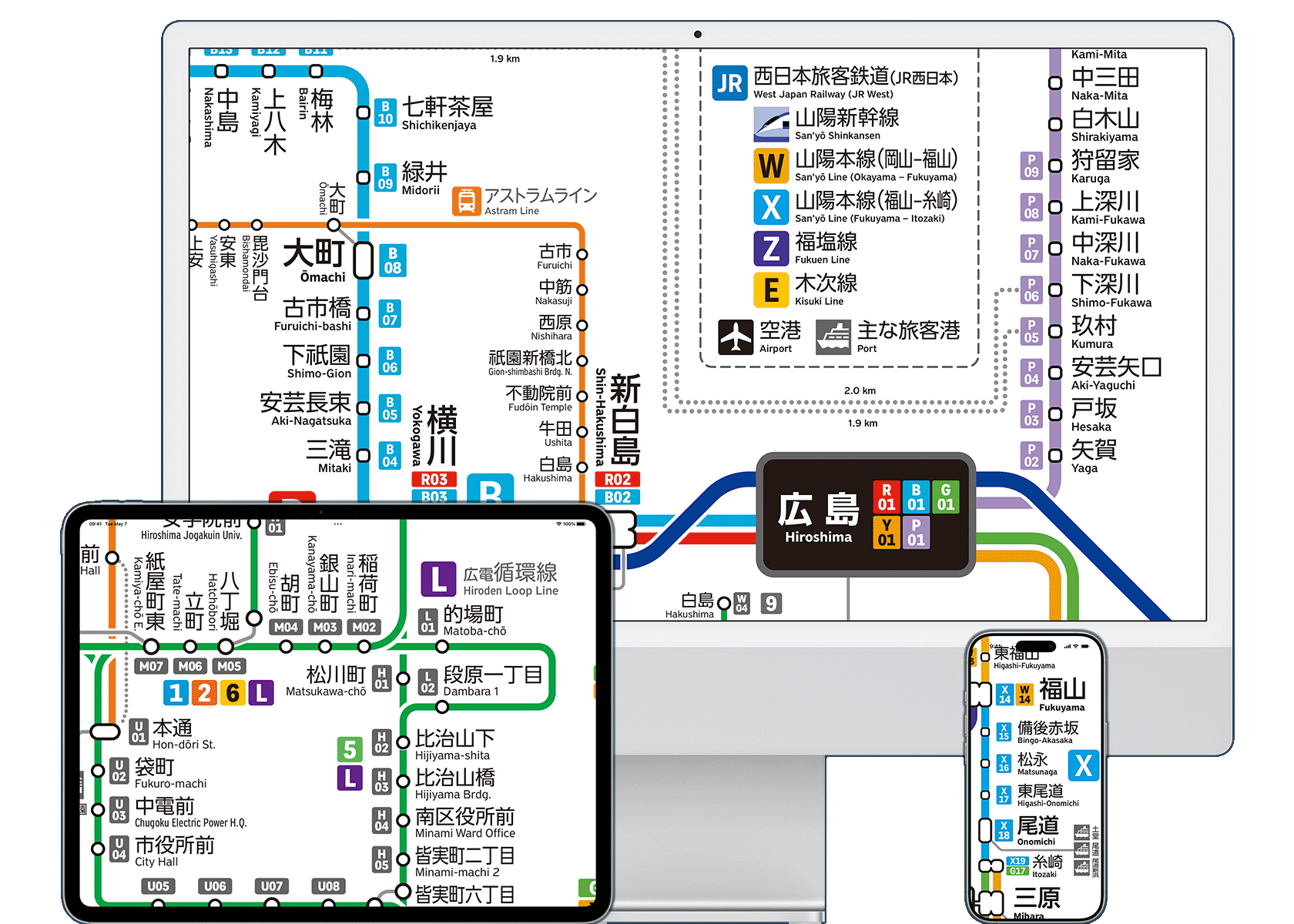 県内の鉄道路線だけでなく、空港や駅からアクセスできる旅客港も載っているほか、広島県ではJRグループ唯一の定期航路であるJR宮島航路も掲載しており、とても便利です。個人利用からビジネスまで、幅広くお使いいただけます。